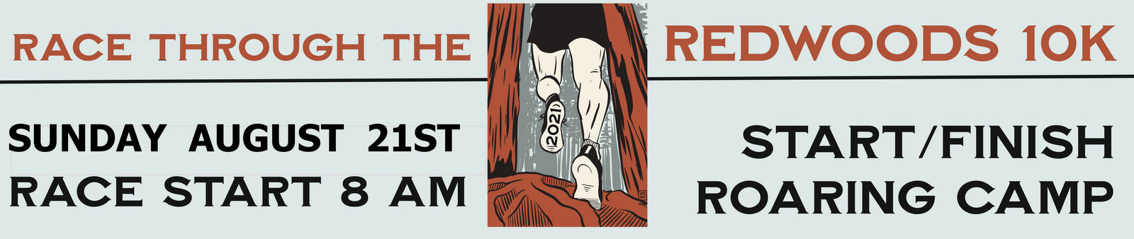 The Race Thru The Redwoods starts and finishes at Roaring Camp Railroads in Felton, California. The majority of the 10K race takes place under the redwoods in Henry Cowell Redwoods State Park. The first mile is on paved or dirt roads, followed by scenic trails under redwoods, through meadows, and alongside the San Lorenzo River. The moderate to challenging course rises approximately 300 feet in elevation between mile 2.5 and mile 3.5. The return is downhill on a mixture of dirt trails and paved roads, and finishes at the starting line in Roaring Camp. The course is marked with mile markers, and staffed with water/aid stations.